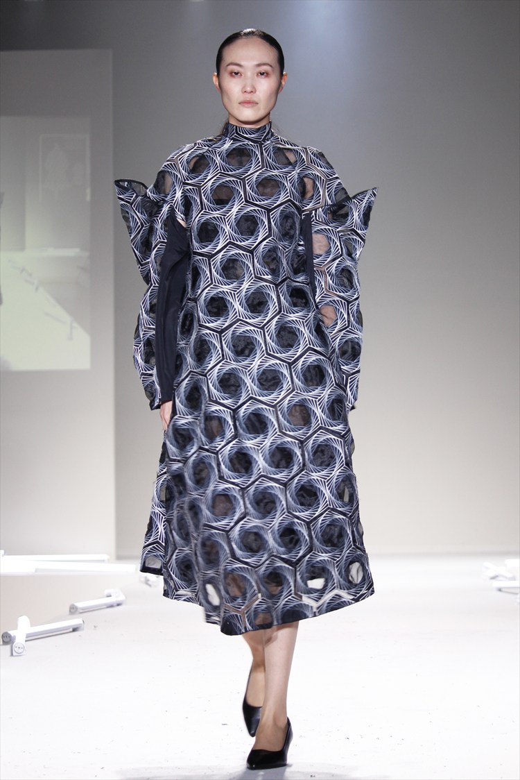 松井さんは、受賞に際し「受賞できたのは嬉しいです。大変だったことはコンテストにデザイン画を出すことは何回かあったんですけど、作品を実際に作ったのは初めてだったので、使ったことのないレーザーカットだったり、刺繍、レーザープリントだったり、初めてのことばかりで、それが少し苦戦しました」と話していた。