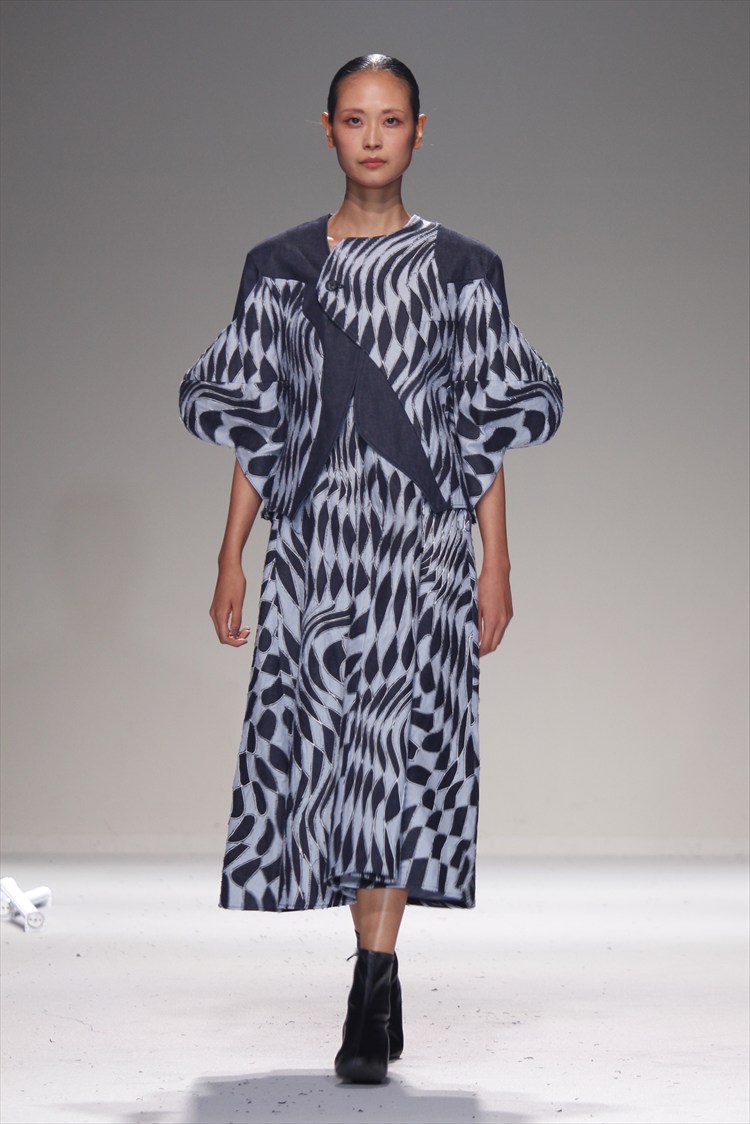 文部科学大臣賞の坪井さんが発表した作品テーマは“Denim on Optical”。デニム地に刺繍を施した後、カッティングとダメージ加工を重ね、布の表面に立体的な凹凸を生み出すことで、素材の表情を引き出した。