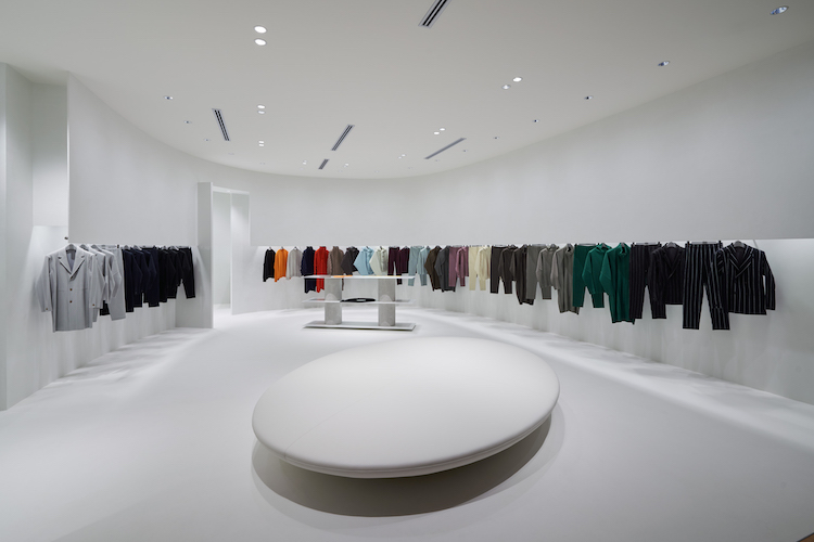 新店舗のインテリアは、円弧状の動線に沿って柔らかく流れるようにデザインされており、白を基調とした明るい空間が特徴。壁面に沿ったラックは自然なラインを描き、プリーツアイテムの色とフォルムが際立つ設計となっている。中心には石のような質感を持つソファが配置され、静けさとあたたかさを併せ持つ空間がゲストを迎える。