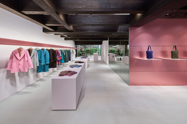 空間デザインを手がけたのは、国内外で活躍するデザイナー・吉岡徳仁氏。店舗の象徴となるのは、“桜色”に染められたアルミニウムの壁面。伝統的な木造建築と輝きを放つ金属素材が対比的に存在し、過去と未来が交差するような独自の世界観をつくり上げている。