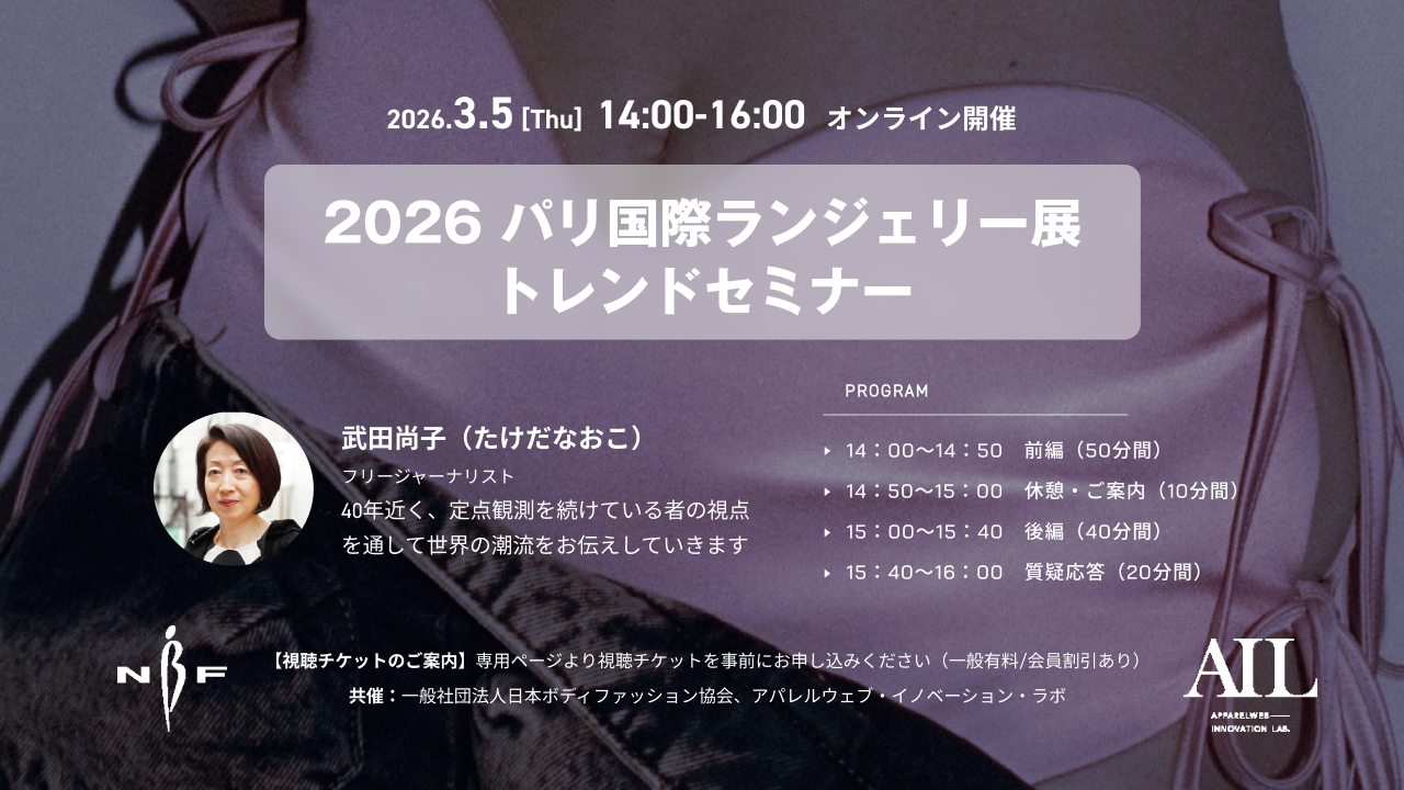 株式会社アパレルウェブ(東京都中央区、代表取締役社長:小平 勝也)は、2026年3月5日(木)に有料オンラインセミナー「2026 パリ国際ランジェリー展」トレンドセミナー」を開催する。