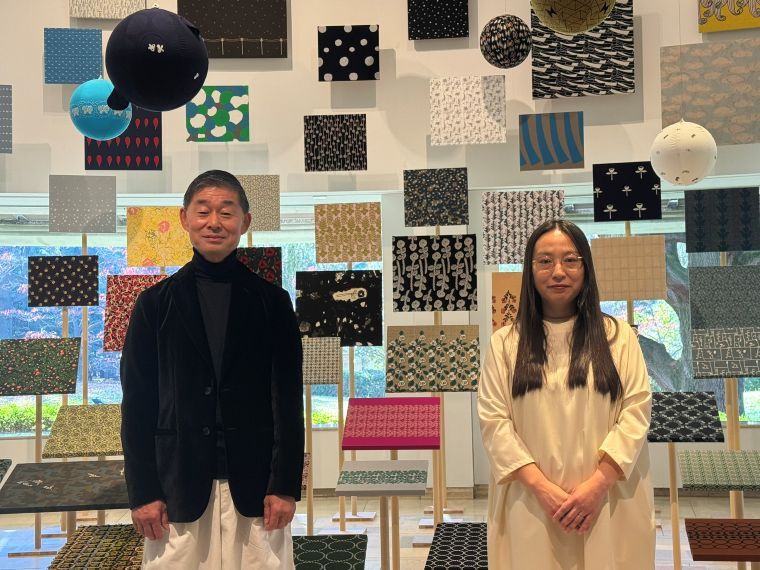皆川明さん(左)と田中CEO。約180種類のテキスタイルの前で