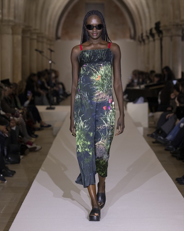 フローラルプリントのコットンドレスで幕開け。カジュアルな素材でありながら、ドレーピングのために生地を贅沢にあしらい、いわゆるプレタポルテのアイテムとは一線を画す仕上がりを見せる。スウィムウェアやランジェリーなどの要素を配しながら、ベージュやカーキなど、徐々にアーシーなカラーパレットのルックに移行。