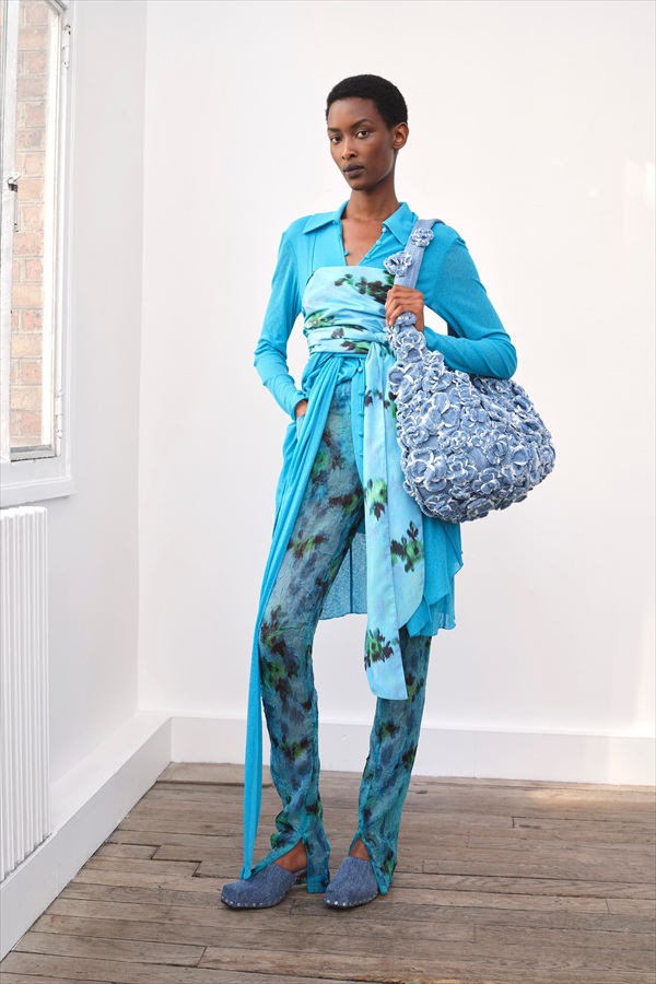 デンマークの漁港の街、ヒアツハルス出身のレフストラップは、子どもの頃に車窓から見た花畑を、霞んだフローラルモチーフでプリント生地に表現。母親が編んだような暖かみのある3Dフラワーニットや、DIY的に仕立てられたコサージュを飾ったワンピース。どれも手作業の魅力が込められている。