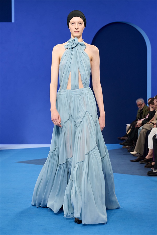 砂漠の遊牧民、ノマド的な装いを想起させるも、依然としてドレーピングやギャザーによる装飾性の高いアイテムで構成され、それぞれにクチュール感が漂っている。しかし、生地の重さを感じさせず、軽やかに仕上げているところにも、クチュールの技術によって裏打ちされていると感じさせたのだった。