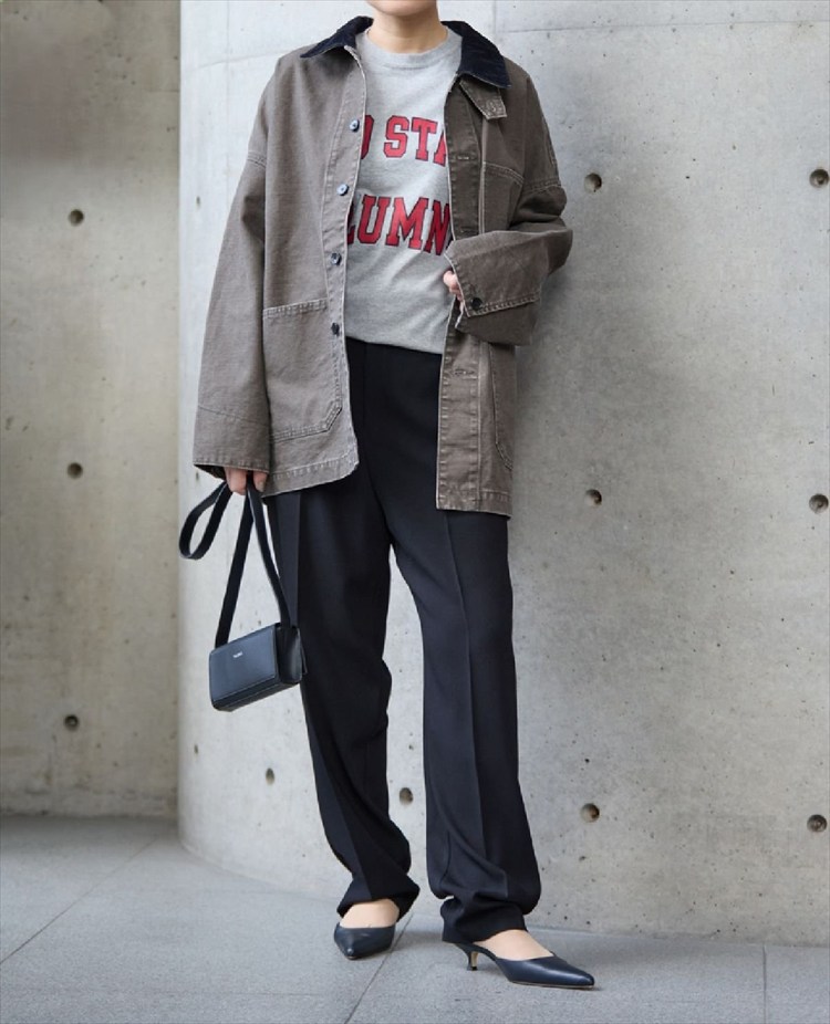 ソフィットのノーカラージャケット。同素材のパンツとのコーディネート