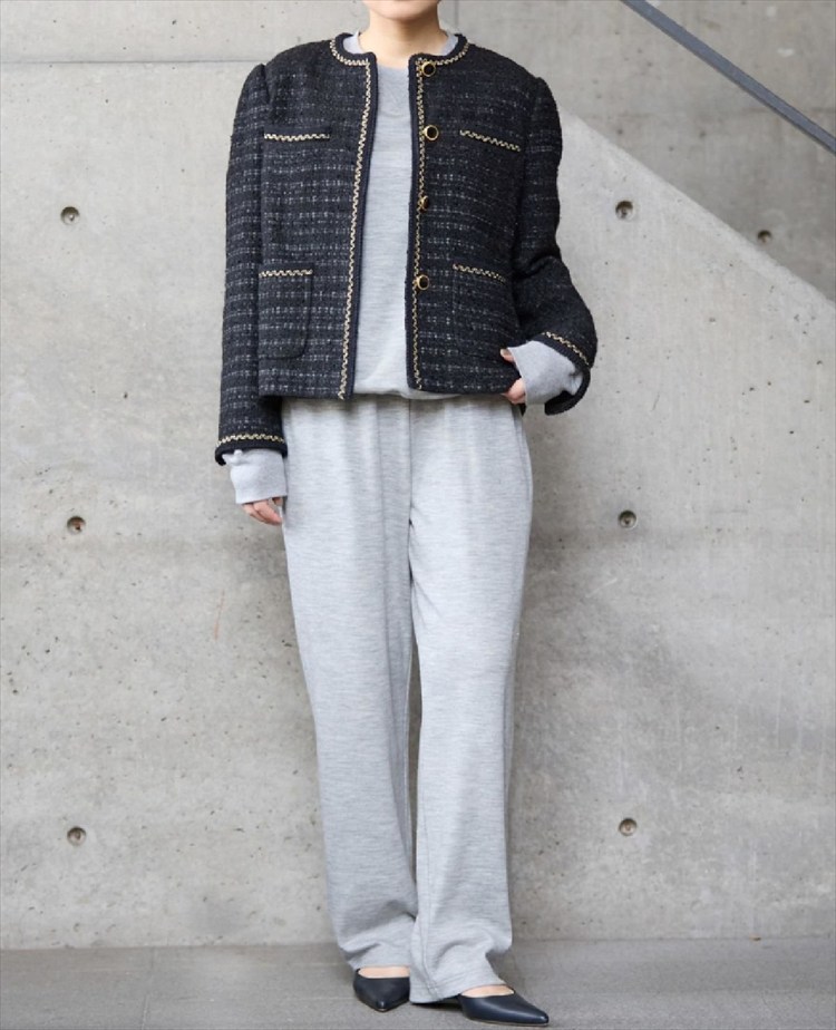 「ツイードノーカラージャケット」(エース)のスタイリング