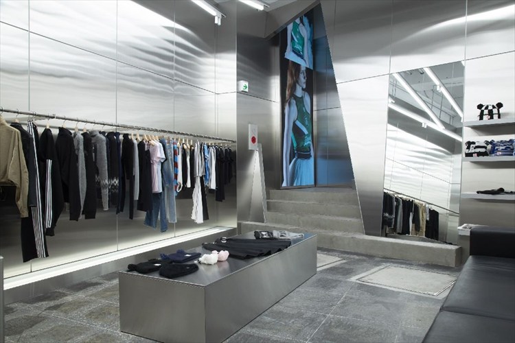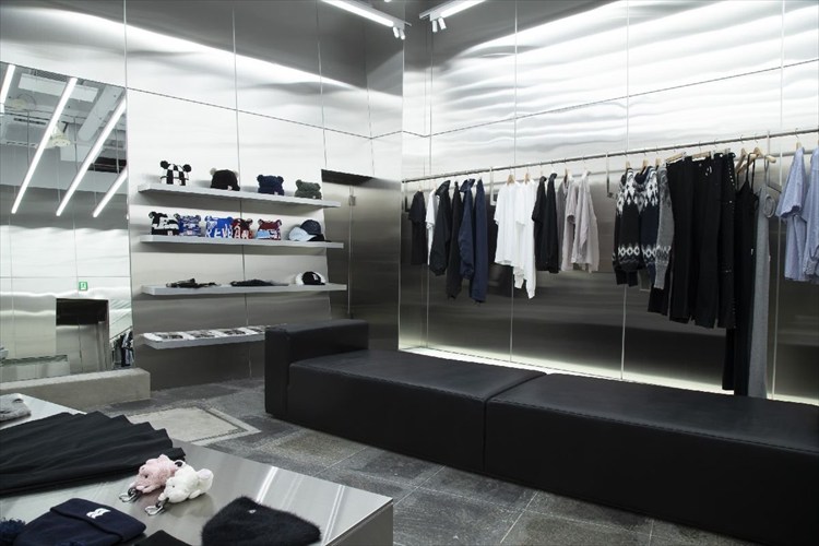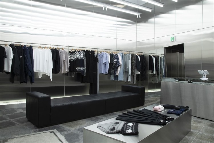 空間はブランドコンセプトである「日常の中に埋もれがちな基本的なデザインを新しい角度で見つめ直し、違和感を再構築する」ことを体現しています。壁面は全て無機質なステンレスで覆い、斜めに傾いているところもあったり、巨大な鏡があったり。エントランスも斜めに切り取り、異質な感じになっています。それらの要素をハンガーポールが構成線となってつないでいる。日常の風景に揺らぎを与えることで、訪れた人に静かな違和感をもたらし、感性がふと立ち止まることを意図して設計しました。
