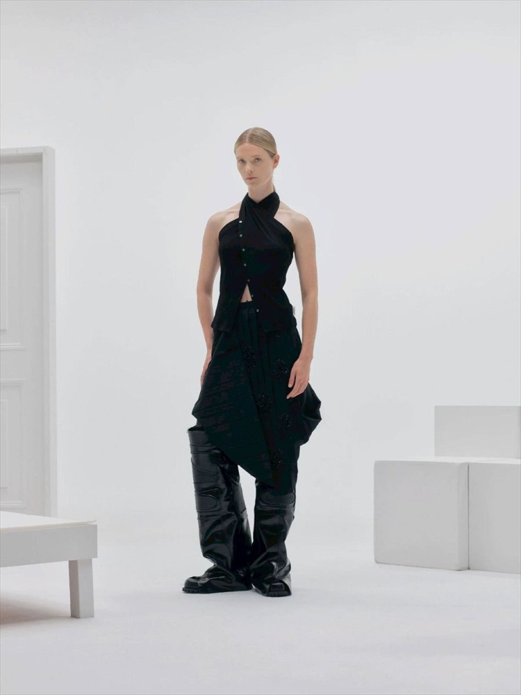 僕は20歳からの2年半、デザイナーのCharles Anastase(シャルル・アナスタス)に師事し、ロンドンで暮らしました。そのときに愛用していた「A to Z」という地図帳に着想を得たコレクションです。SEASON αでは、始まりから終わり、さらにその先へと続くストーリーを設定し、それを基にコレクションを制作しました。前回まではシルエットを重視していたんですけど、今回はスカートがめくれた状態になっているとか、タンクトップがボディスーツになっているとか、ワンピースやシャツを横向きにして着るなど、パターンそのもので造形しているのが大きな特徴です。各アイテムを広げるとAからZまでのアルファベットの形になっていて、もちろん全てがリアルクローズとして着られます。普遍的でありながら、想像力を刺激するようなコレクションになっています。
