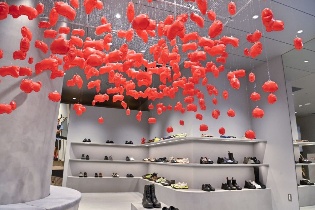 「カンペール渋谷パルコ」は、渋谷パルコの4階に立地。店舗を構成する要素を可能な限りそぎ落とし、モルタルとスチールによるグレーを基調とした51㎡のミニマルな空間は、壁面の棚や売り場内に点在する什器に整然と陳列されたプロダクトを際立たせる。大きな特徴は、シーズンごとに変化するインスタレーション。このインスタレーションによって、ブランドの世界観やシーズンテーマを伝えていく。什器類は可動式で、天井にはパーティションなどを随意に設置できるレールを設けることで、ディスプレイの自由度を高め、インスタレーションやVMDのフレキシブルな展開を可能にした。 オープニングを飾ったのは、アーティストユニット「DAISY BALLOON(デイジーバルーン)」によるインスタレーション。今年3月に開催されたカンペールの50周年イベント「CAMPER 50 YEARS YOUNG」の会場で行ったインスタレーションを渋谷パルコ店のオープンに際して再構築した。50周年イベントではブランドのシグネチャーカラーとロゴ、アイコニックモデルの「PELOTAS(ペロータス)」と「KOBARAH(コバラ)」の特徴的なシルエットやソールを大胆なバルーンアートで表現したが、今回は共鳴を意味する「Resonance(レゾナンス)」をコンセプトに、粒子に見立てた丸いバルーンが新たに形を成していく様子を可視化した。「丸い形が外側から中心に向け、振動しながら形を変えていく、それらは個々の変化と同時に、全体を通して記憶の像を形成していく」(デイジーバルーン)過程を体感できるアート作品だ。インスタレーションを横や近くから見ると不規則なバルーンの集まりに見えるが、正面通路から見るとカンペールのブリッジロゴが現れる。実店舗だからこその体験を通じて来店客とブランドがつながるきっかけであり、カンペールが重視してきたコミュニケーションの在り方を象徴するアプローチとも言えるだろう。
