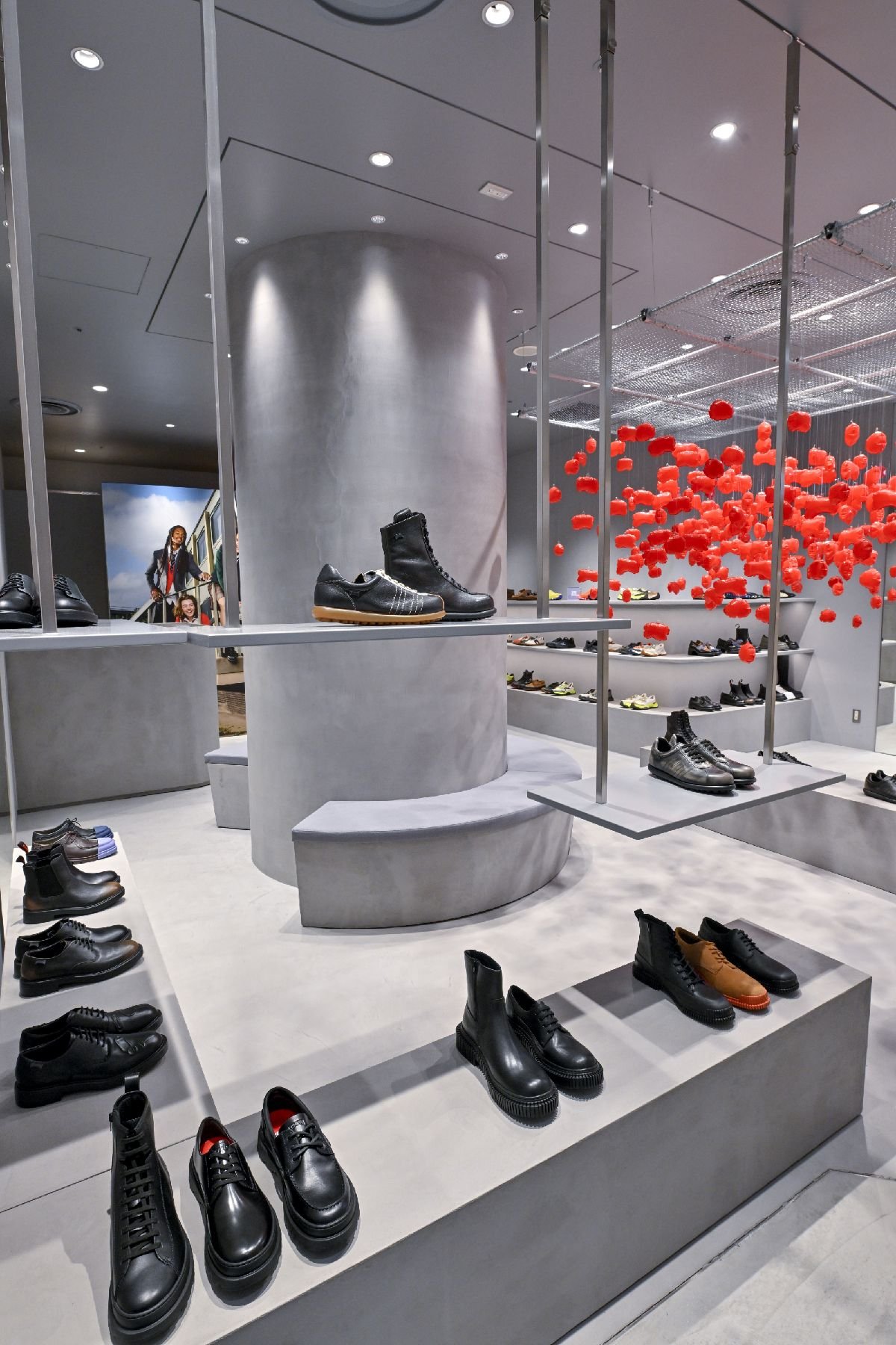 遊び心の体現は店舗の空間デザインについても変わらない。カンペールは現在、世界約40カ国に店舗展開しているが、店舗ごとの「個性」を重視した空間を創ってきた。日本で展開する直営店47店舗も同様だ。直近では例えば今年3月に移設リニューアルした大阪髙島屋店と8月に新規出店した池袋パルコ店は、マヨルカ島へのオマージュをコンセプトに地中海らしい不規則なテクスチャーのタイルを使用し、ブランドを象徴する赤と白で構成。8月にリニューアルした新丸ビル店も同じコンセプトながら、ナチュラルカラーの長方形の無垢粘土タイルとグリーンのコントラストで地中海のアイデンティティーを表現した。いずれもカーボンフットプリント削減のため、世界中で入手可能な素材を採用していることも特徴となっている。その後、既存店舗とは全く異なるコンセプトストアとして9月19日にオープンさせたのが渋谷パルコ店だ。