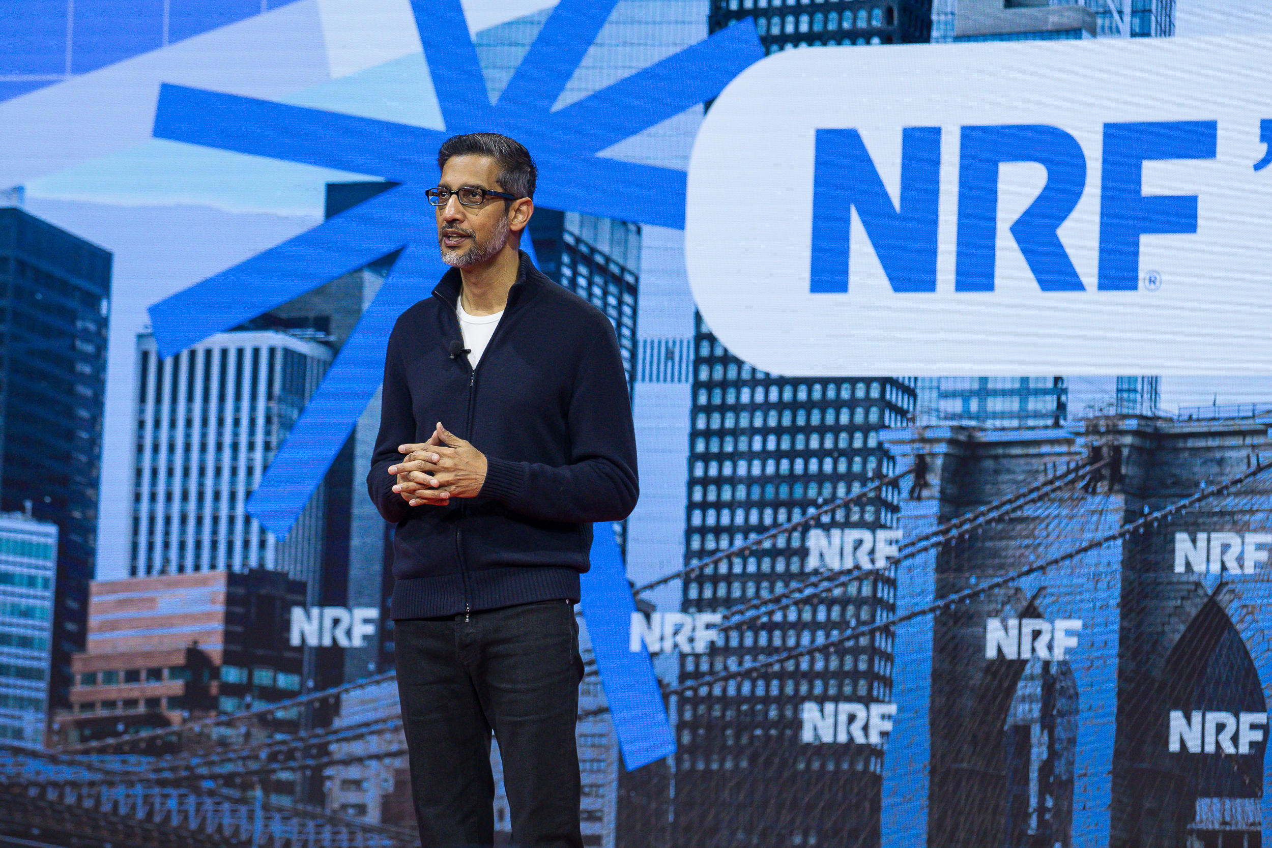 「NRF 2026」初日、筆者が最も注目したキーノートセッションは、Google(グーグル)およびAlphabet(アルファベット)CEOである Sundar Pichai(スンダー・ピチャイ)氏と、米 Walmart(ウォルマート) 社長兼CEOである John Furner(ジョン・ファーナー)氏による対談でした。公式セッションタイトルは、“The AI platform shift and the opportunity ahead for retail”――AIを単なる“機能”としてではなく、“プラットフォームの転換”として捉え、その先に広がる小売の可能性を示す――といった論点で議論が繰り広げられました。